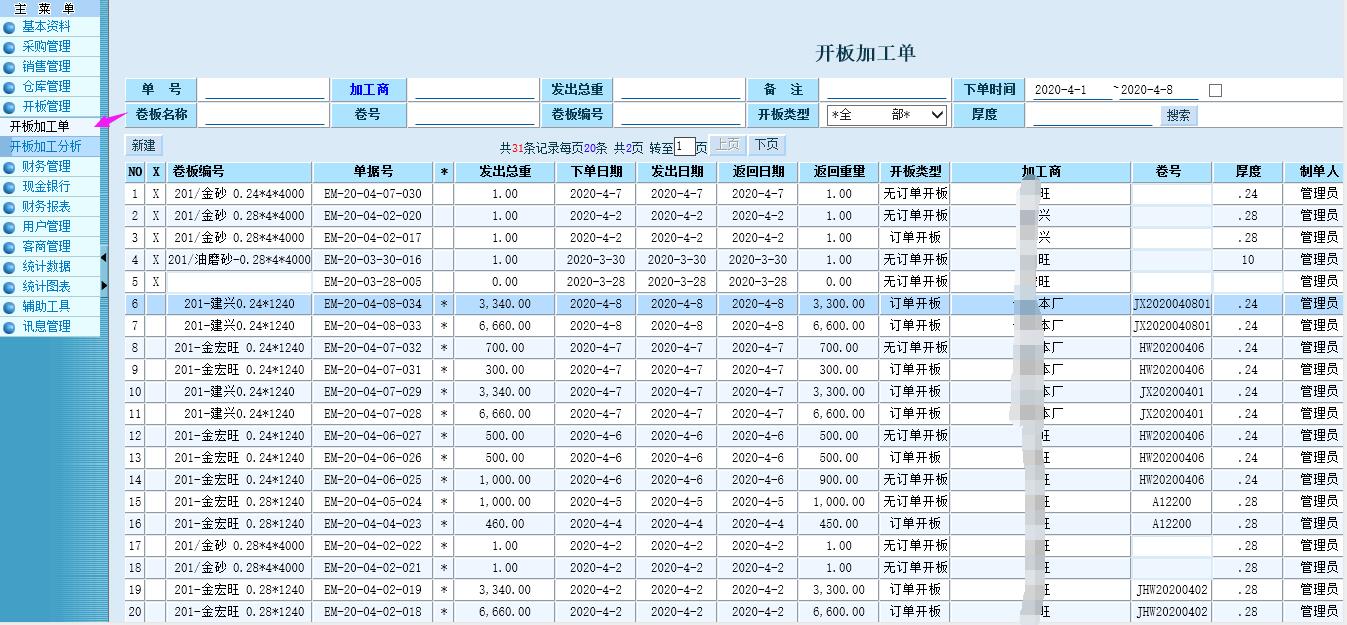 不銹鋼開板廠ERP生產(chǎn)管理系統(tǒng)產(chǎn)品介紹:天朗不銹鋼開板ERP系統(tǒng)主要是針對不銹鋼開板加工、貿(mào)易、配送等業(yè)務(wù)管理,不銹鋼開板廠,一般按訂單加工為主,本系統(tǒng)通過卷板“卷號”為主線,全程跟蹤卷板從采購入庫、客戶銷售訂單、開板加工、銷售出貨的每個環(huán)節(jié)。本系統(tǒng)幫助不銹鋼開板廠,記錄每一卷不銹鋼卷板開平板的過程,隨時了解銷售訂單目前開板狀態(tài),是否已經(jīng)開板等。一旦客戶反映質(zhì)量問題,可以反追蹤對應(yīng)卷板的供應(yīng)商,大大提高售后服務(wù)能力。同時系統(tǒng)自動計算出每個卷號卷板的單米成本、卷板開板加工費(fèi)用等。 ![]() ![]() ![]() ![]() |